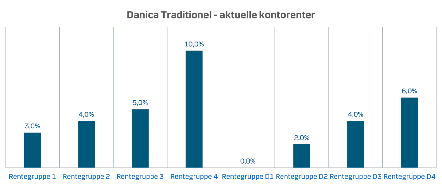 Det underliggende afkast i Danica Traditionel påvirkes naturligvis af markedsudsving, men da du som kunde i Danica Traditionel får en kontorente, som er ret stabil fra år til år, oplever du ikke de store daglige udsving på din pensionsopsparing.