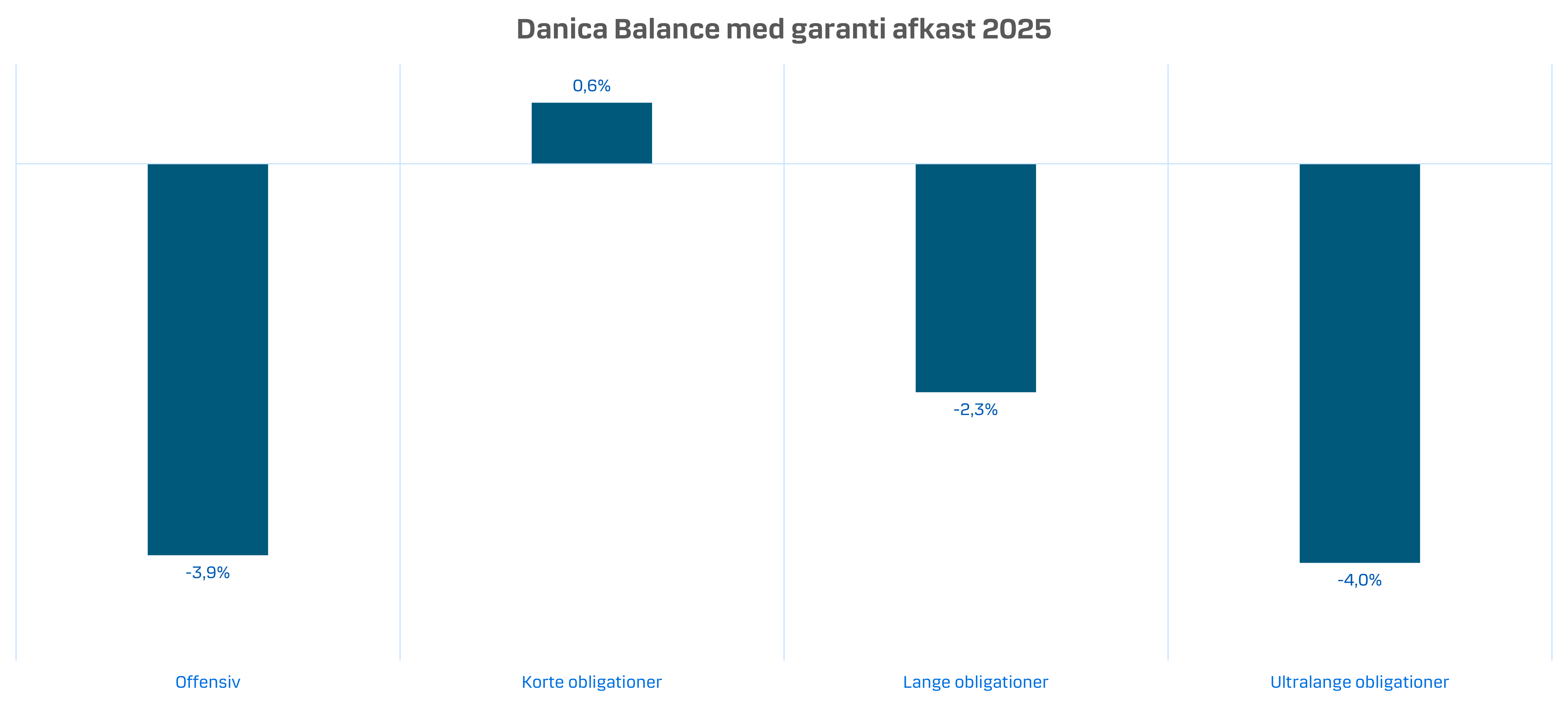 For Danica Balance med garanti betød det, at de offensive investeringer, som hovedsageligt udgøres af aktier, endte med et afkast på -3,9 procent, og obligationsinvesteringerne leverede mellem 0,6 procent og -4 procent i afkast afhængig af varigheden. Det personlige afkast vil være afhængig af tid til pension og udbetalingernes længde og der vil derfor være forskel i afkastet fra kunde til kunde.