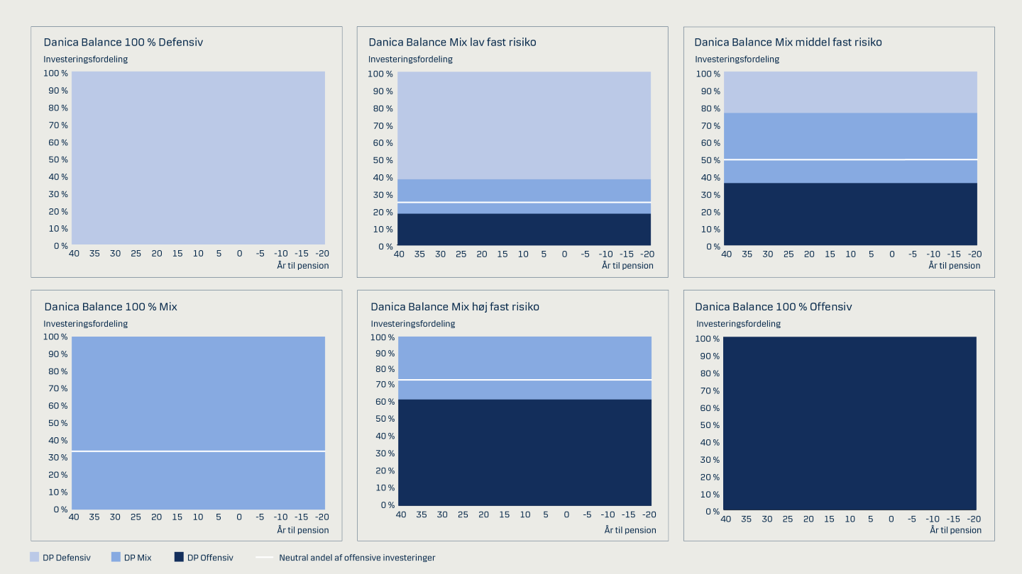 Som alternativ til en nedtrapning af din risiko kan du vælge en fast sammensætning af din investering over hele opsparingsperioden. Her tilpasses risikoen altså ikke efter din alder.